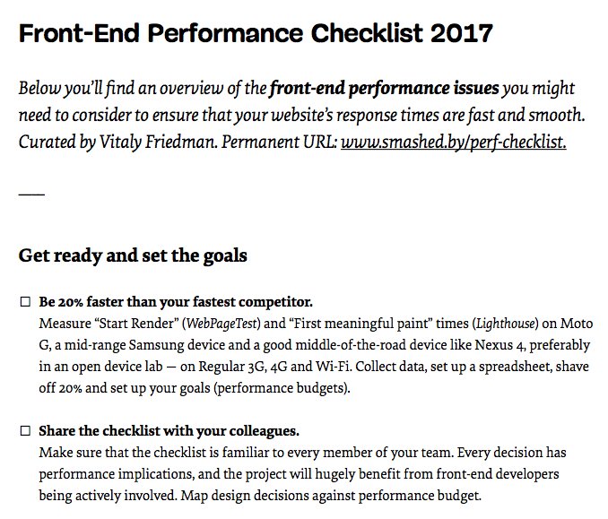 Comprehensive performance checklist! Start adding it to your projects! My two cents: start small, find quick wins, check off more over time.https://twitter.com/smashingmag/status/810813009585115136 …