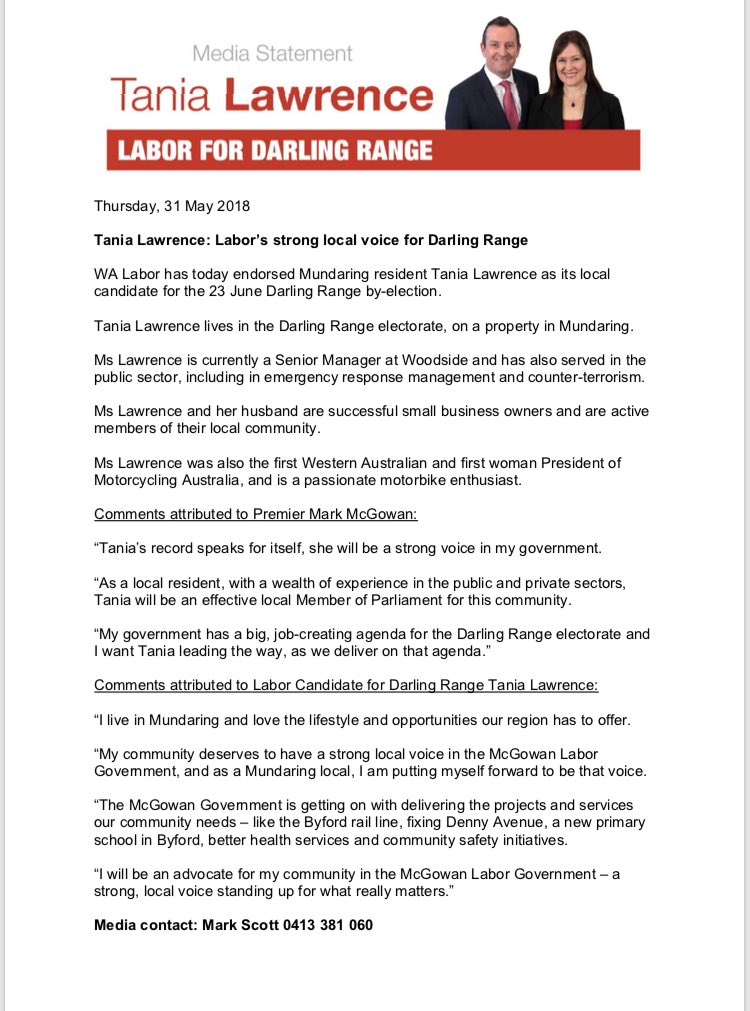 Here’s the statement from WA Labor on new candidate for Darling Range Tania Lawrence. Premier says her CV will be released later today.
