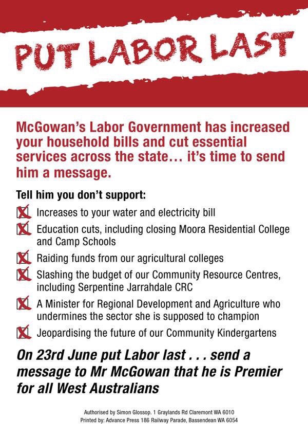 My message to Darling Range voters is put Labor Last to send a message to McGowan and that the Regions matter. Cuts to education, CRCs, keeping Royalties for Regions etc all matter.