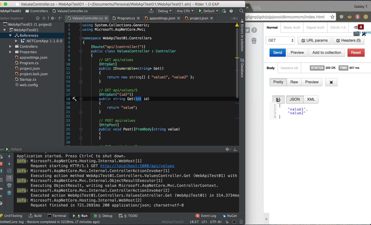 #dotnetcore WebAPI using@JetBrainsRider, and I love it!pic.twitter.com/zWsEMiBK80