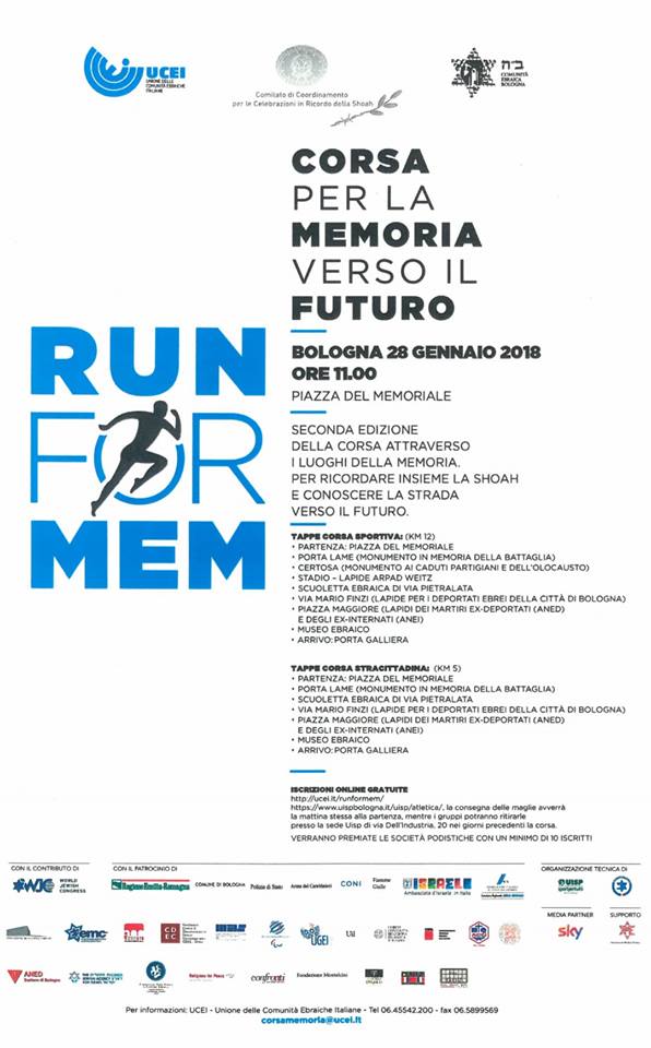 "Corsa per la Memoria verso il Futuro". BOLOGNA, January 28th GENNAIO: 11.00. PIAZZA DEL MEMORIALE. Second Edition Bologna Shoah Memorial