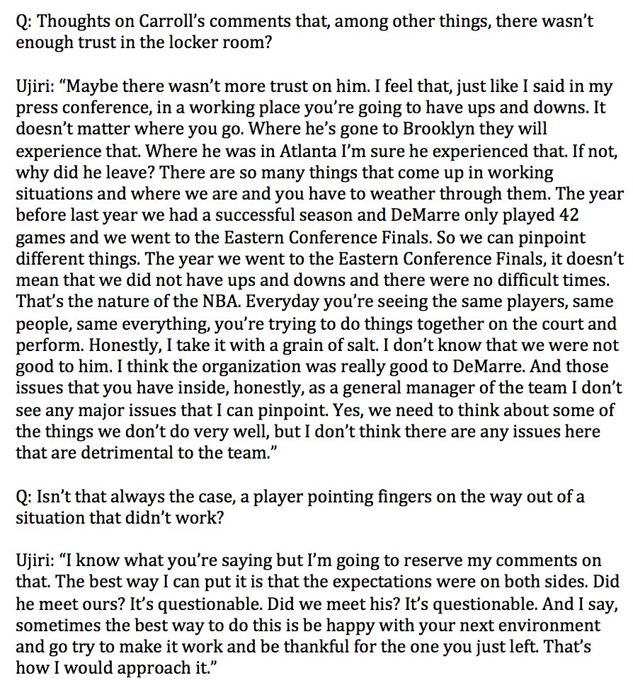 Ujiri on Carroll: "The expectations were on both sides. Did he meet ours? It’s questionable. Did we meet his? It’s questionable"