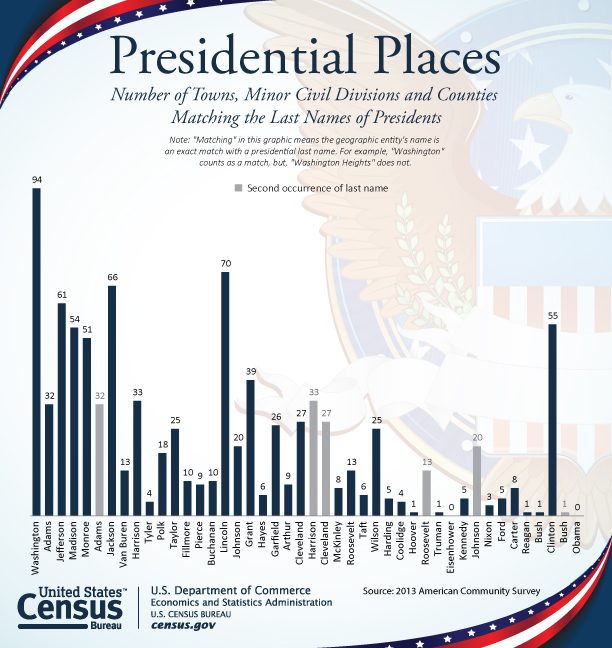 Check out the # of towns, minor civil divisions and counties matching the last names of presidents: http://go.usa.gov/x9udv .