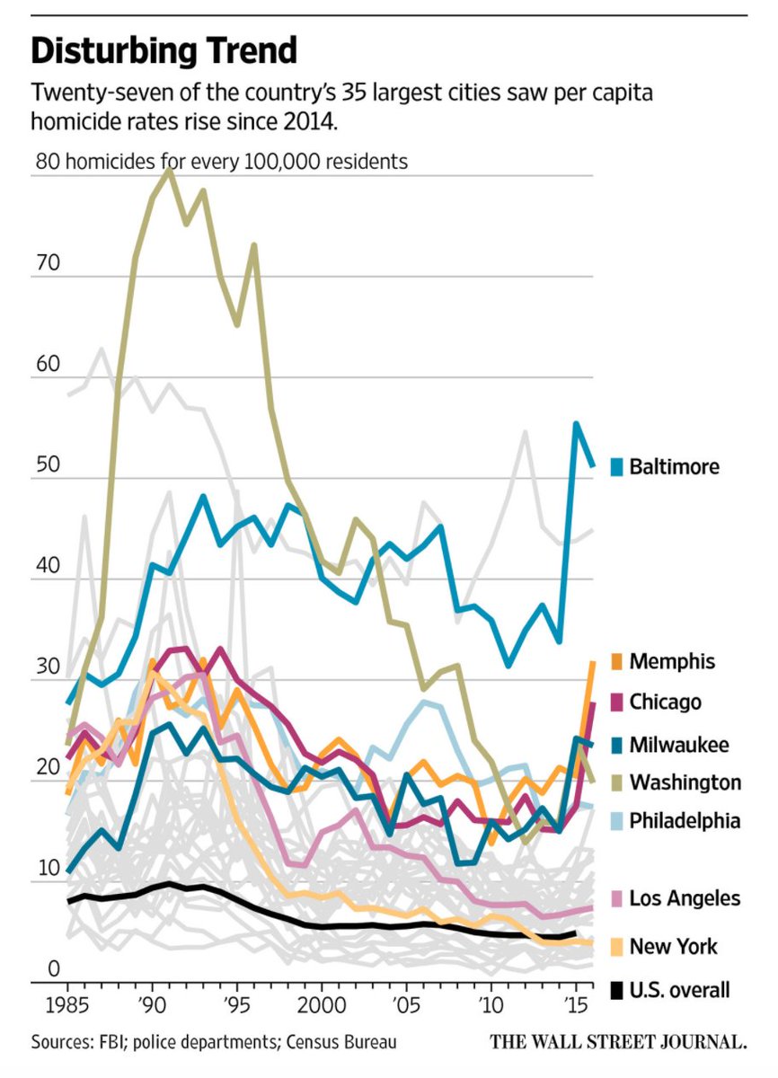 WSJ analysis finds 4 US cities (Baltimore, Chicago, Memphis, Milwaukee) nearing/exceeding their 1990s murder records https://www.wsj.com/articles/with-their-rising-homicide-rates-four-cities-stand-out-1487592002?mg=id-wsj …pic.twitter.com/M8JVVJXQ4g