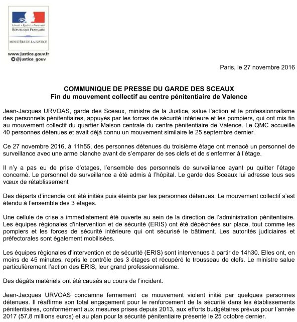 @JJUrvoas Ministre de la Justice - Fin du mouvement collectif au centre pénitentiaire de Valencepic.twitter.com/RVObKNoh12