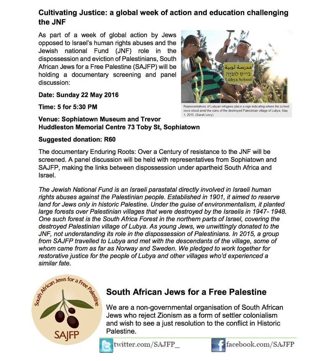 23. BDS SA members at SA Jews for a Free Palestine "cultivating justice" event in historic Sophiatown