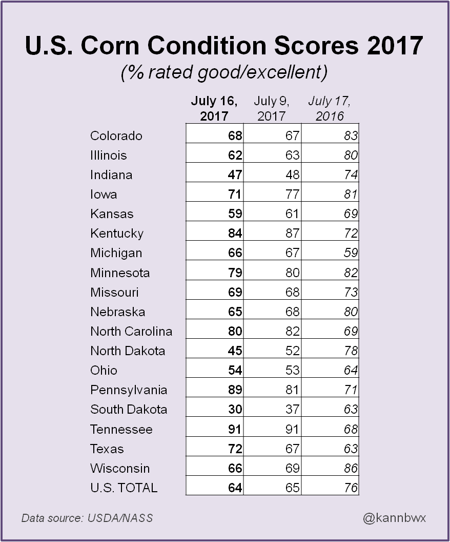 USDA: 64% of U.S. rated good/exc, was 65% wk ago. Declines in most major states. IA dn 6%, NE dn 3%, and they will be hot this week.