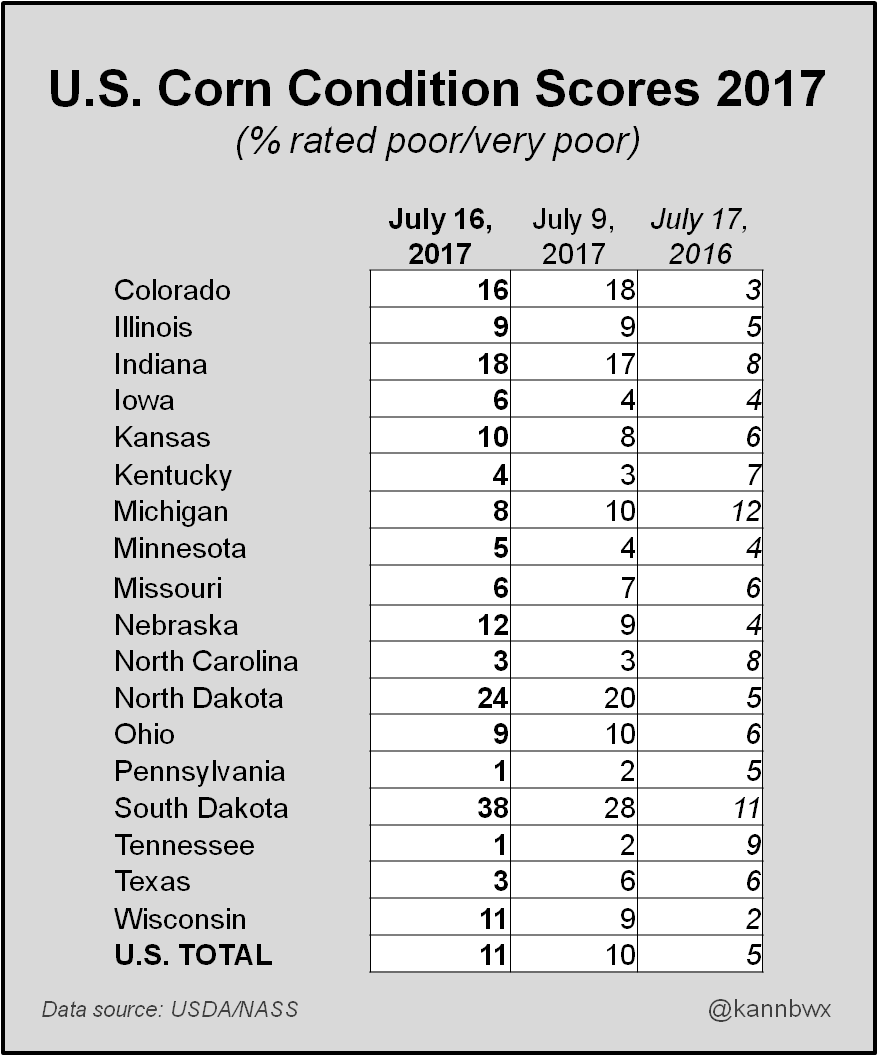 poor/very poor edged up 1pt to 11%. SD added 10pts, ND 4, NE 3, IA 2. Again, next few days are hot and dry in these states + others.