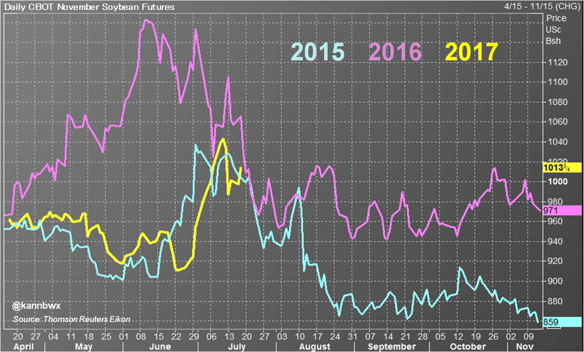 New-crop didn't break $10.20 after this week in 2015 or 2016. All three prices are very similar on this date. Where to next?