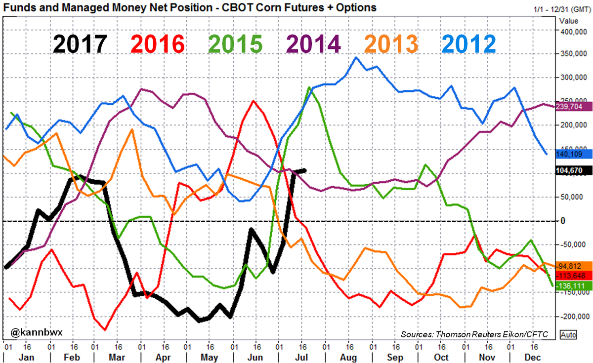 Funds defended their long thru Jul 18 even w/ price plummet late last wk. Net now 104,670 fut+opt contracts vs 100,964 wk ago.