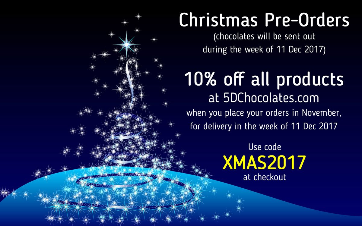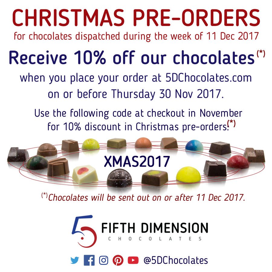 LAST DAY TO TAKE ADVANTAGE OF OUR CHRISTMAS PRE-ORDER OFFER! You can preorder our chocolates from our website and have them delivered mid-December, and receive a 10% discount when you apply the code XMAS2017 at checkout. https://www.5DChocolates.com pic.twitter.com/UVTxaYcJRv