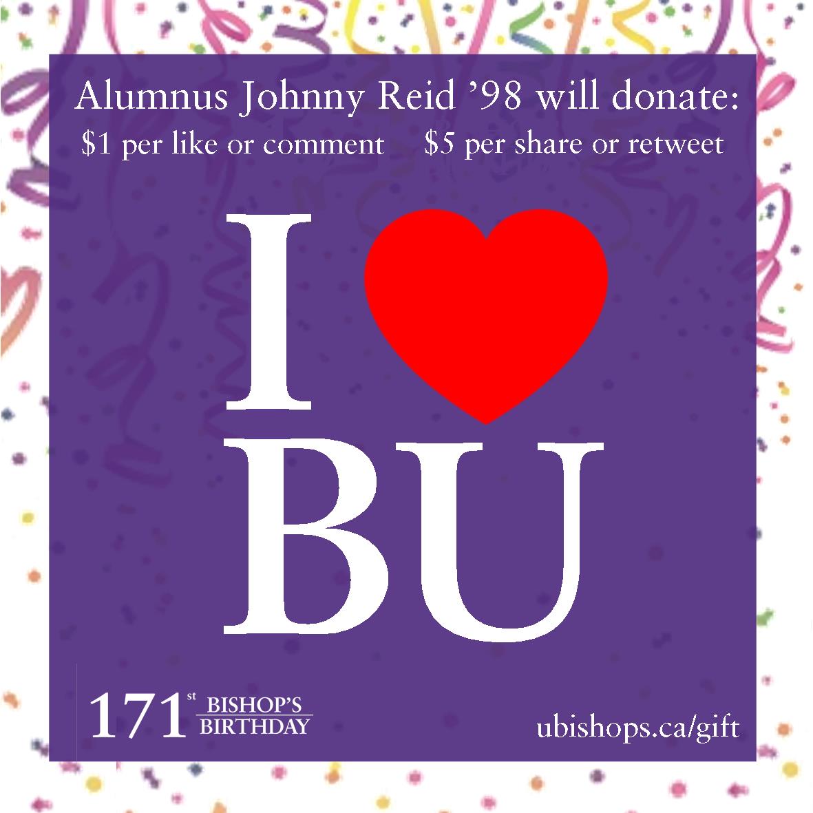 @UBishops: Proud BU alumnus@JohnnyReid will donate for each like, RT and reply on this image today#BUbdaypic.twitter.com/p5EQ5p8cUI