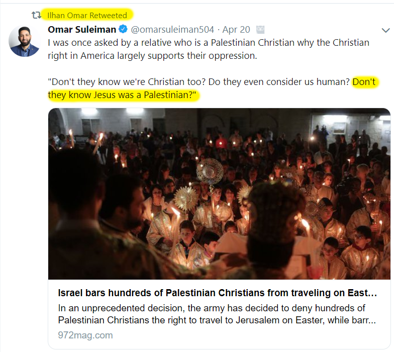 We were just reminiscing about how we used to joke around saying "Next they're probably going to say Jesus was Palestinian!" And it was funny because nobody would ever say something that dumb.