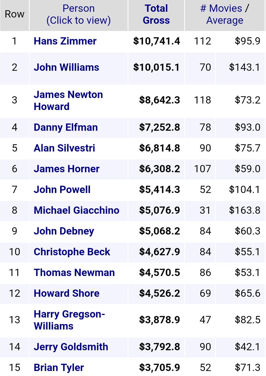 En cuanto a los compositores el más taquillero es Zimmer. También hay que decir que cuenta con 42 películas más que John Williams.pic.twitter.com/qwdFSamygk