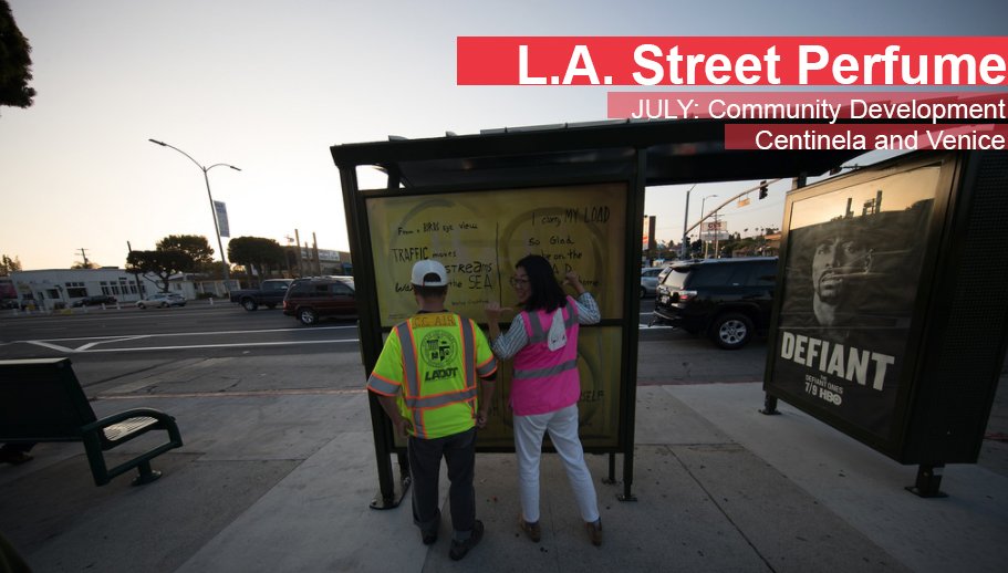 Smell L.A.'s street perfume! Stop by the bus stop on Centinela Ave and Venice Blvd to smell this month's scent "Community Development".
