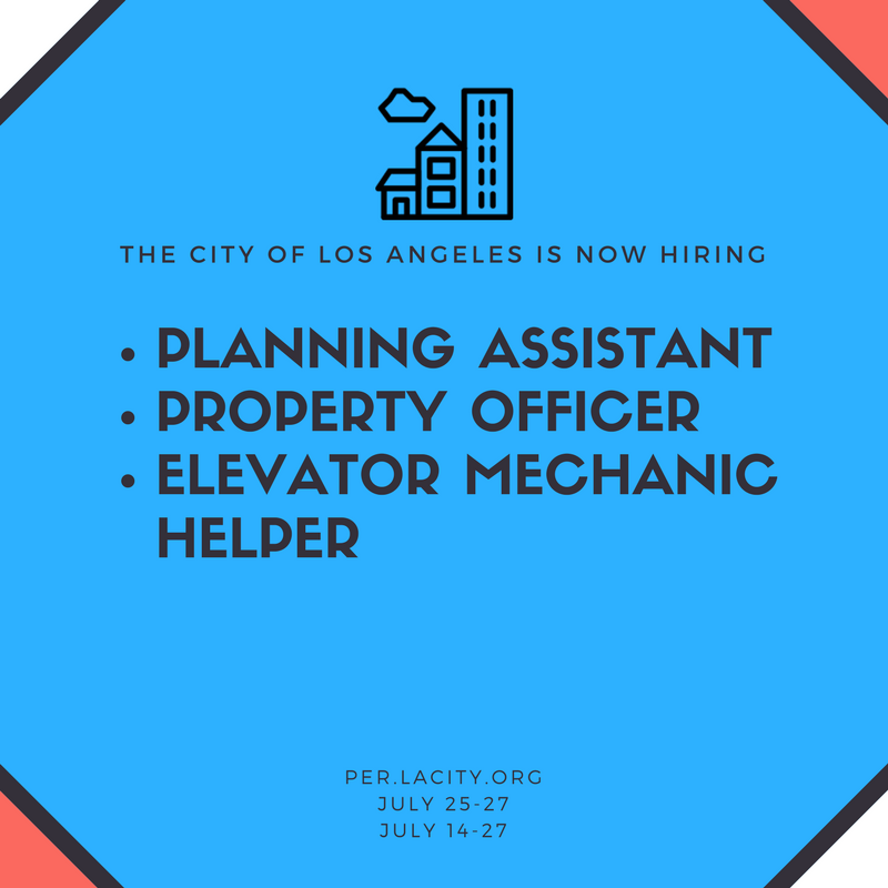 We are now hiring Planning Assistants, Property Officers, and Elevator Mechanic Helpers! Please apply at https://www.governmentjobs.com/careers/lacity !