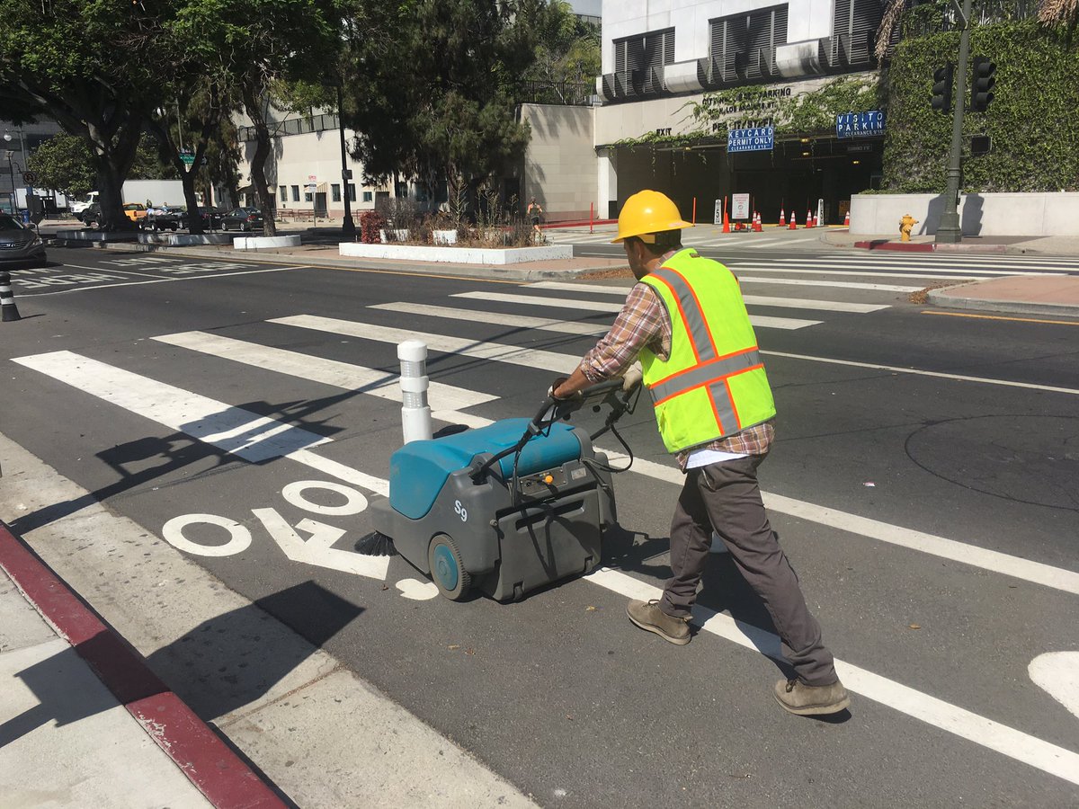 The new BSS electric, walk-behind "micro-sweeper" cleaned the Los Angeles St protected bike lane today on its maiden voyagepic.twitter.com/mo5zjoq7OJ