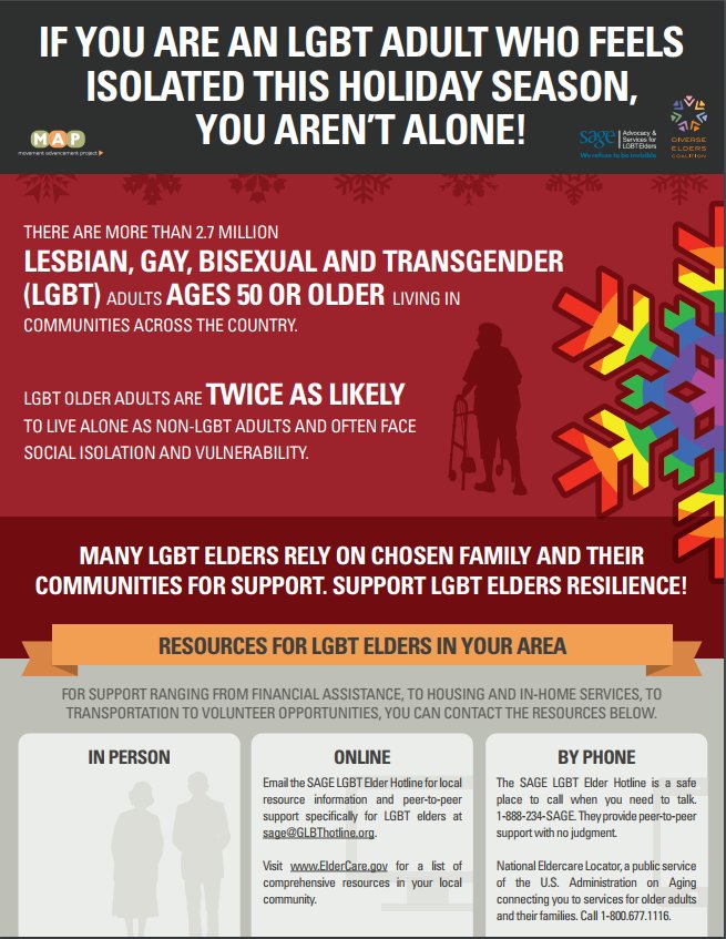 #LGBT older adults are twice as likely to live alone & often face social isolation around holidays. New graphic from@lgbtmap,@SAGEUSA, &@DiverseElders has resources for#lgbtelders http://bit.ly/2zNvl2r pic.twitter.com/CFtsY5temY