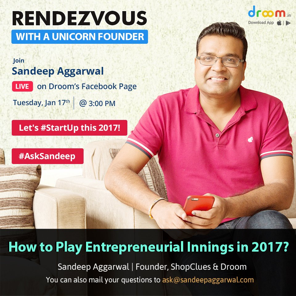 #AskSandeep is back again to let you#startup2017 with great success. Catch Unicorn Founder@SandeepAgg LIVE on Droom's FB page on 17th Jan.pic.twitter.com/0JN2SmZ4Ur