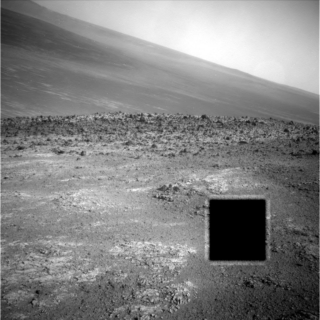 Bild des Opportunity-Rovers (das schwarze Viereck ist bloß so 'n Monolith oder ein Tor in ein Paralleluniversum).