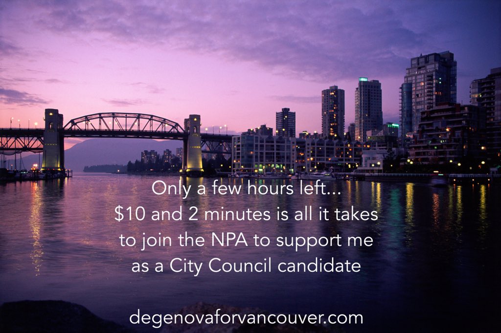 Only a few hours left! Please JOIN THE NPA as a member to support me as a City Council Candidate. Vancouver needs to turn a corner, but I can’t do it without you! Please sign up now at http://www.degenovaforvancouver.com