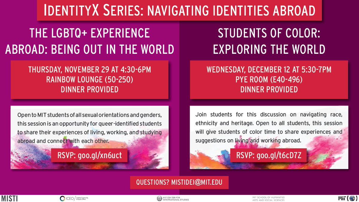 Two upcoming MISTI IdentityX Series events! Join us on 11/29 4:30pm in the Rainbow Lounge for The LGBTQ+ Experience Abroad: Being Out in the World, and on 12/12 5:30pm in E40-496 for the Students of Color: Exploring the World discussion
