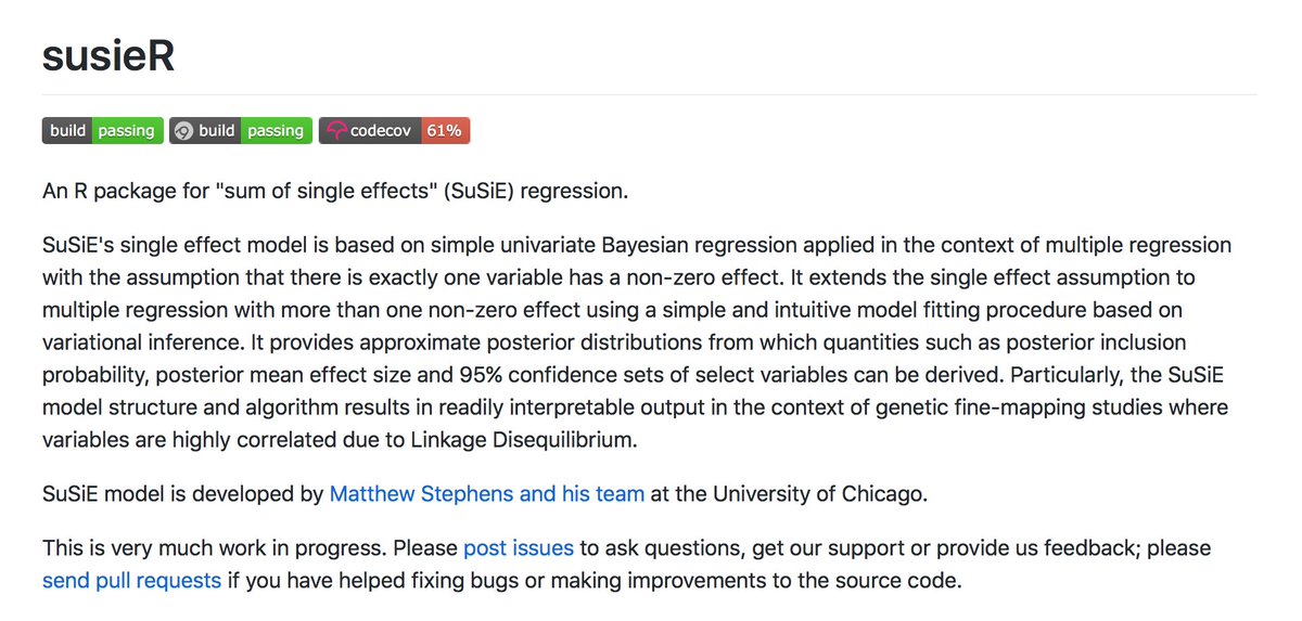 @broadinstitute by@mstephens999 Introduced a new approach - "sum of single effects" (SuSiE) regression - to address problem of fine-mapping in human genetic association studies Yields credible sets signals at each locus https://github.com/stephenslab/susieR …pic.twitter.com/7PFeNamGgt