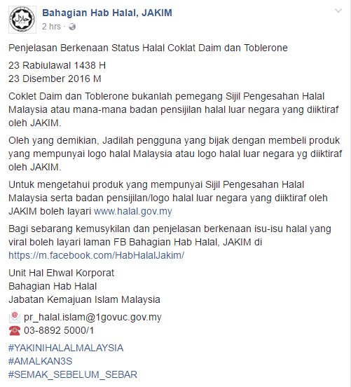 2. JAKIM mengesahkan coklat jenama Daim dan Toblerone bukan pemegang Sijil Pengesahan Halal Malaysia.