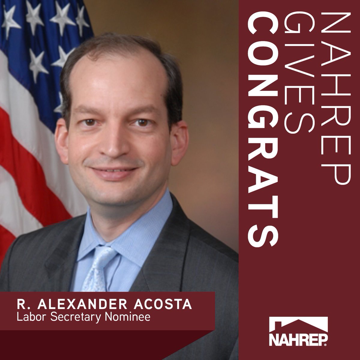 NAHREP congratulates law school dean and former assistant attorney general, R. Alexander Acosta, for his nomination as Secretary of Labor.pic.twitter.com/9Y1Cz6Sxso
