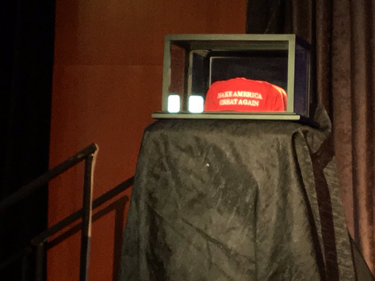 For some reason there is a Make America Great Again hat in a glass box at the side of the stage at Trump eventpic.twitter.com/gYgTxTFV35