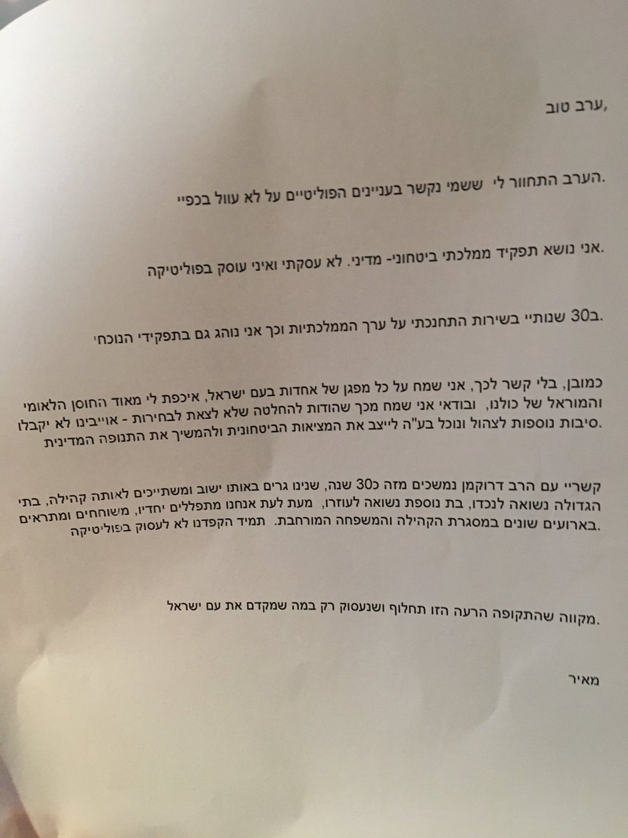 המכתב הזה לא הולם בכל כך הרבה רמות אבל בעיקר מצביע על רדידות. לאיש ביטחון אין שום עסק בשאלה אם יהיו או לא יהיו בחירות; "המורל" של אויבינו הוא לא טיעון. אם לא עסק בפוליטיקה עם דרוקמן, במה עסק? בביטחון? הוא לא מתייחס ולא מכחיש ומקנח בקשריו המשפחתיים עמו. בקיצור זו התחנפות לנתניהו.