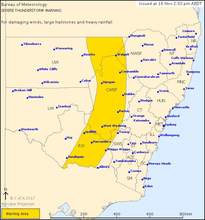 Warning issued for damaging wind gusts, large hail and heavy rainfall for parts of the central inland. Area includes Walgett and Brewarrina. See latest details at