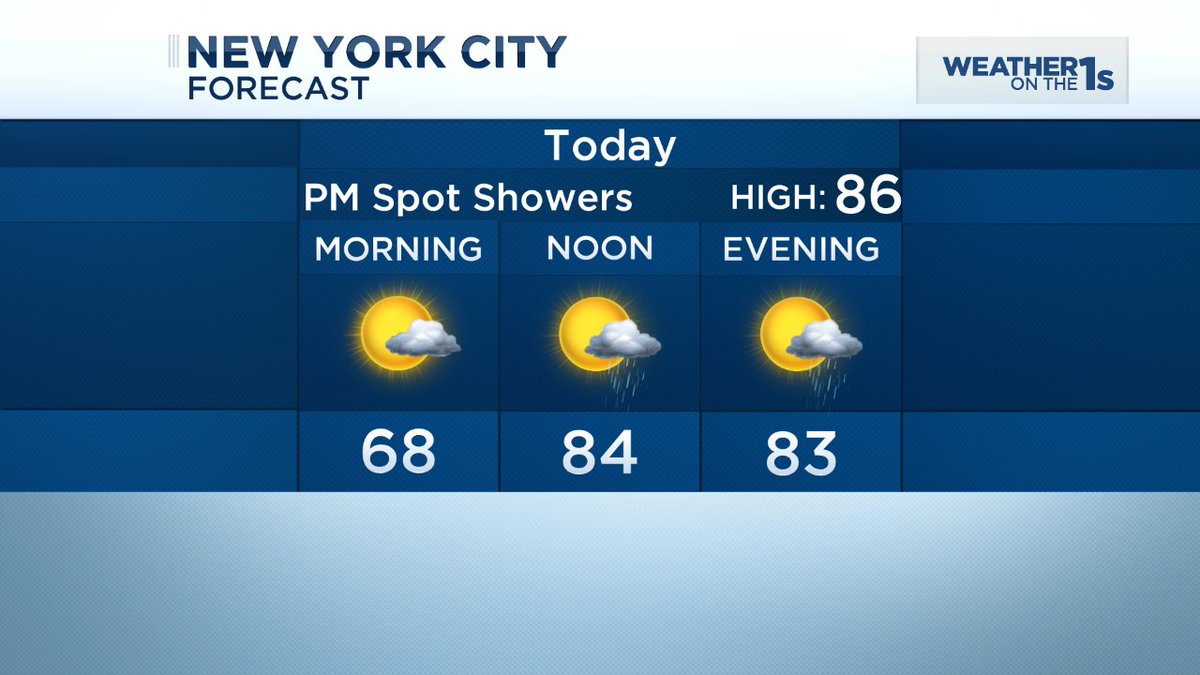Look for partly sunny skies and warmer conditions today. Some areas could see a brief shower as well. High: 86