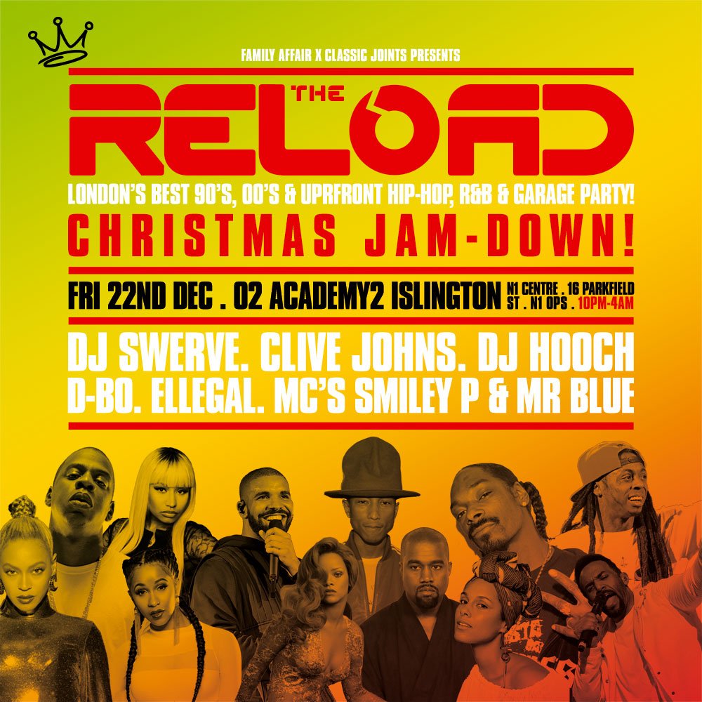 #TheReload is throwing the ultimate Xmas bash next Fri 22nd Dec.@dj_swerve from#KissFM leads an all star bill playing the best 90's, 00's & Upfront Hip-Hop, R&B & UK Garage! Doors 10pm, over 18s. Adv tix available here >>> http://bit.ly/TheReload_2017 pic.twitter.com/CRgCZ2uDi3