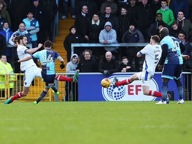 Doyle slips in the box, but still manages to tee-up Stevens, whose effort is deflected behind (90+3 mins)