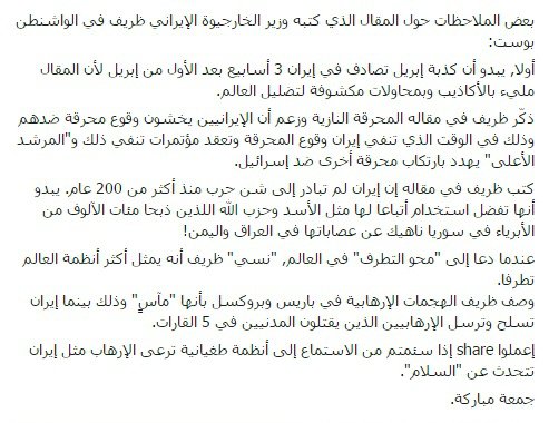 @JZarif في الواشنطن بوست. إعملوا ريتويت إذا سئمتم من#أكاذيب_إيران. جمعة مباركة.pic.twitter.com/t3Uq99jIUn