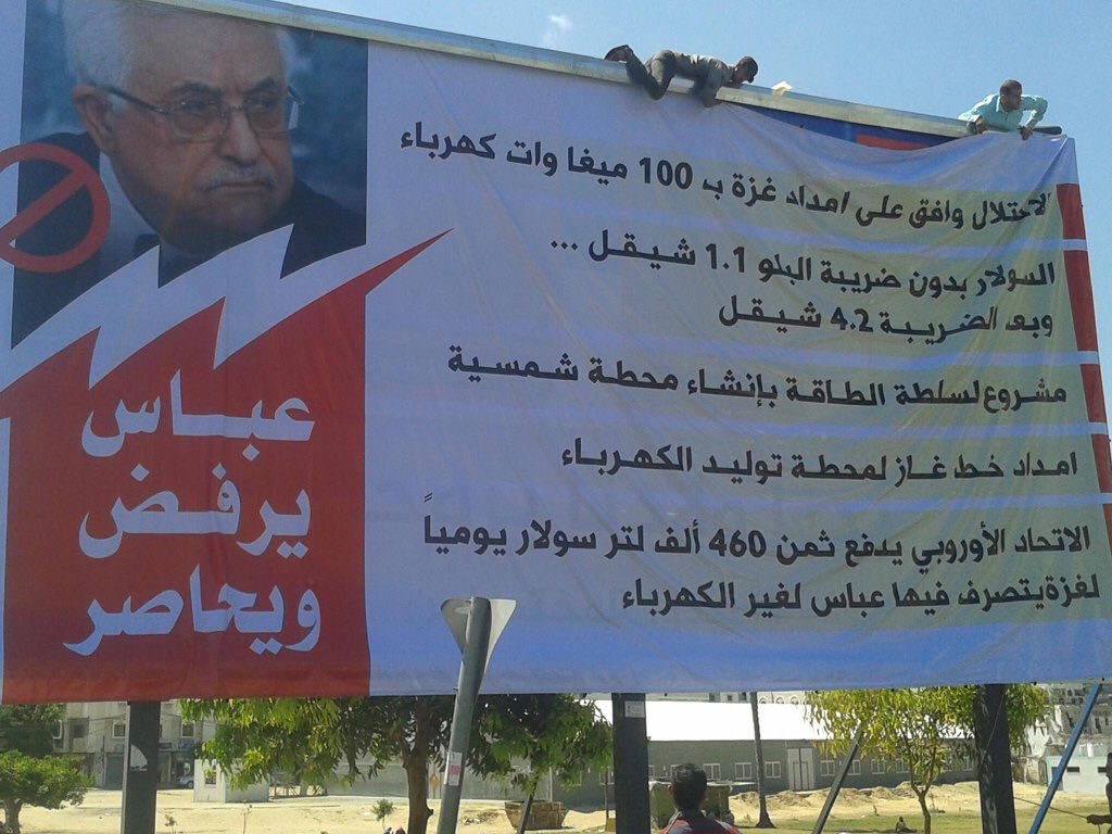 שלטי חוצות בעזה שמטילים על אבו מאזן וראש הממשלה חמדאללה את האחריות על המצור ועל בעיות החשמל ברצועהpic.twitter.com/IzHBwkoaJv