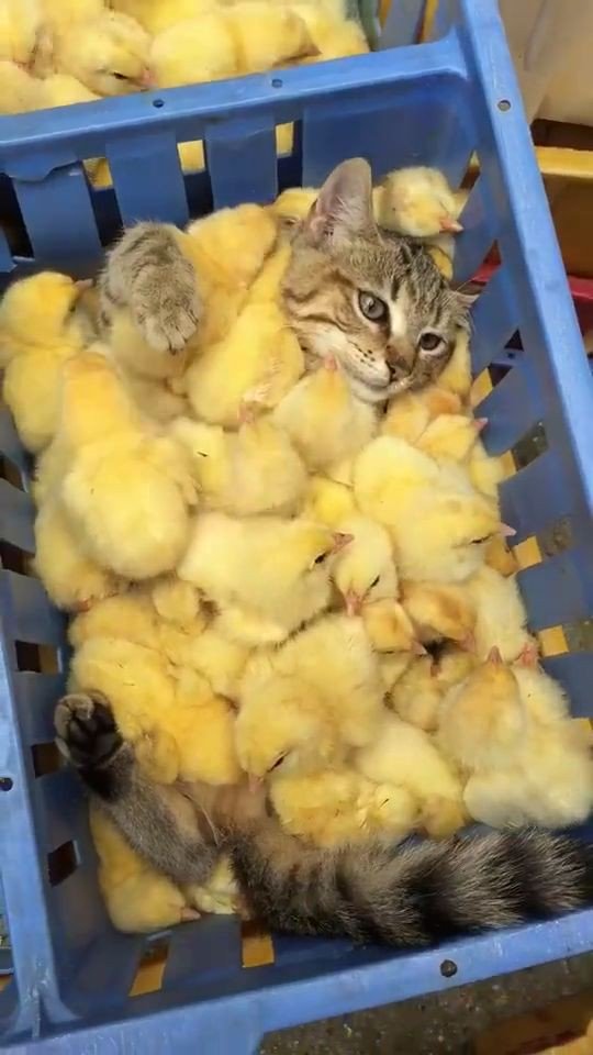 12. OMG, how cute: Kitten covered in chicks