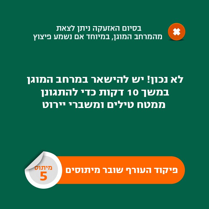 42. בהישמע אזעקה, יש להיכנס למרחב המוגן ולהמתין בו 10 דקות ורק אז לצאת ממנו! לפרטים נוספים: