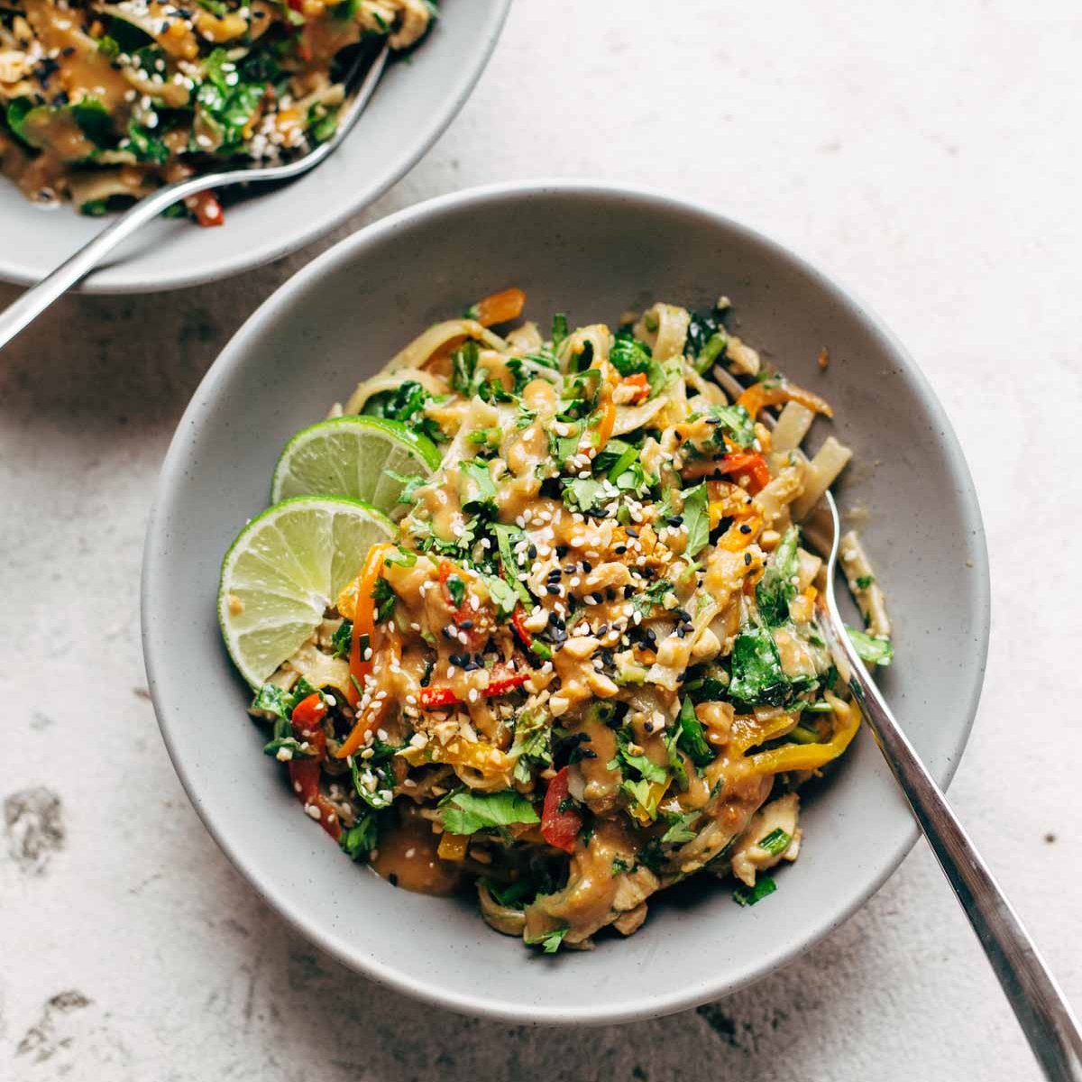 THAI NOODLE SALAD! Veggies, chicken, noodles, and a peanut lime dressing.