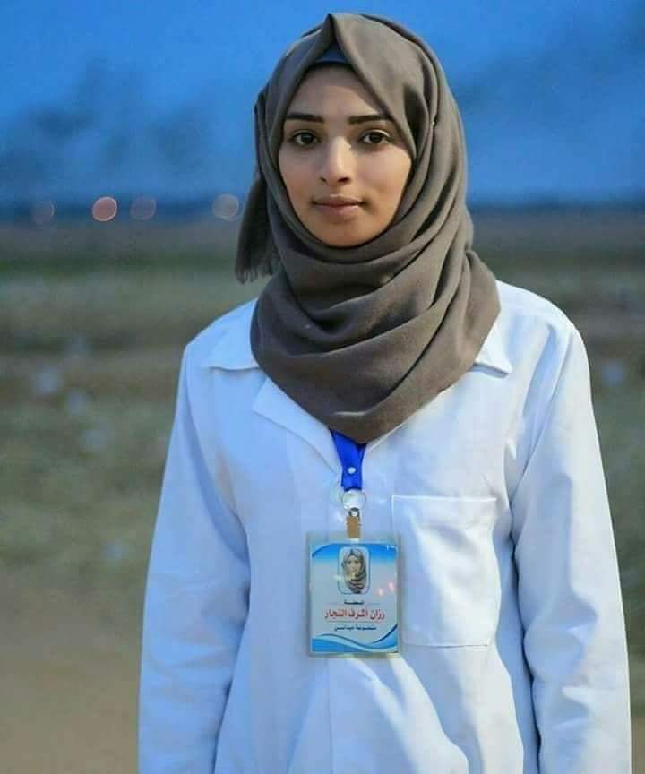 Se llama Razan al-Najjar era enferemera hasta que recibió un disparo en el pecho de un francotirador israelí en el día de hoy. Se encontraba proporcionando ayuda médica a los manifestantes heridos. Allah i rahma. Otra víctima más de Israel y la complicidad occidental.