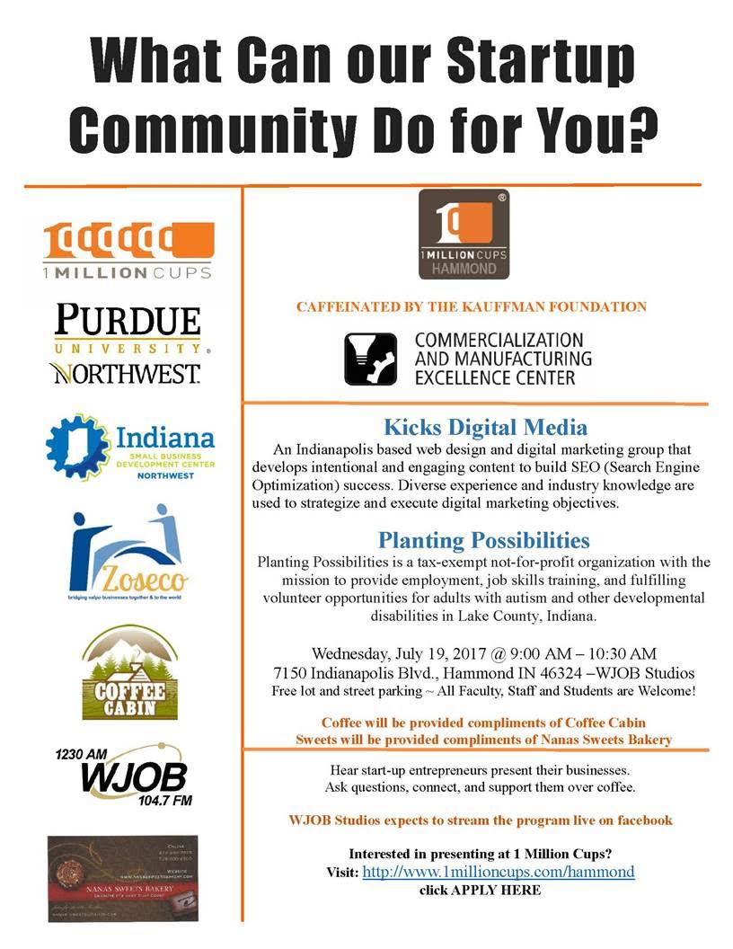 @1MillionCupsHMD at#PurdueNorthwest's CMEC (Commercialization&Manufacturing Center) in Hammond!https://twitter.com/nwisbdc/status/892039383007731712 …