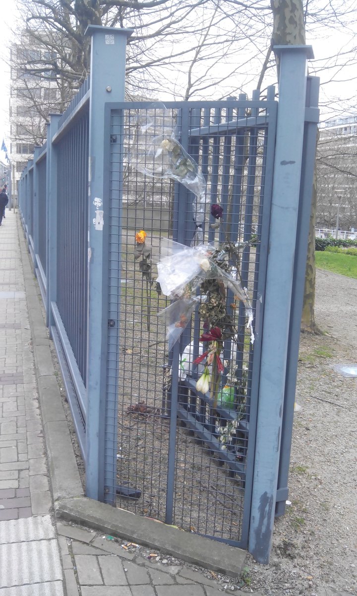 15. Left Brussels. Airport was endlwss searches, barbed wire, temporary buildings. In city, many flowers&notes.
