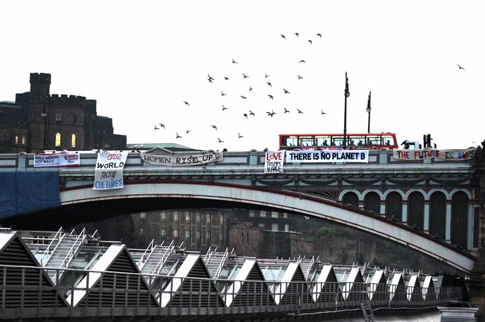 #BridgesNotWalls Edinburgh. "One world many cultures." "Women rise up." "Love Trumps Hate." "There is no planet B." "The future is ours."pic.twitter.com/Y3hn1aVqDH