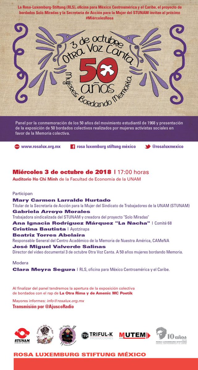#Invitación#MiércolesRosa 3 de octubre Otra Voz Canta. 50 años mujeres bordando Memoria