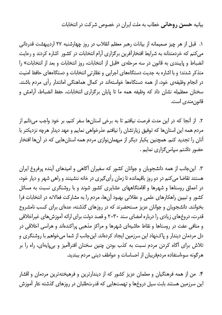 مردم عزیز ایران، اگر تندروها عکس من را پاره کردند یا حتی جلوی ستادهایم به من ناسزا گفتند، جوابشان را ندهید. آنها هدف دیگری دارند.pic.twitter.com/56FcoO51lg