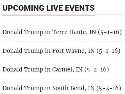 Current Trump Indiana dates for Sun/Mon: Sun: Terre Haute 1PM Ft Wayne 4PM Mon: Carmel 4PM South Bend 7PMpic.twitter.com/m0astZaj8C