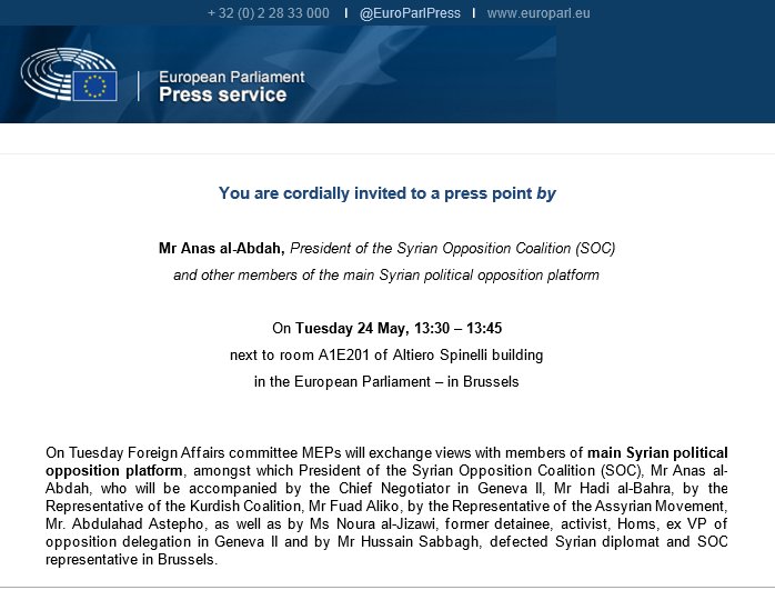 Press point of Mr Anas al-Abdah,President of Syrian Opposition Coalition at 13:30. LIVE: http://ec.europa.eu/avservices/ebs/live.cfm?page=1 …pic.twitter.com/3SNqReAb9U
