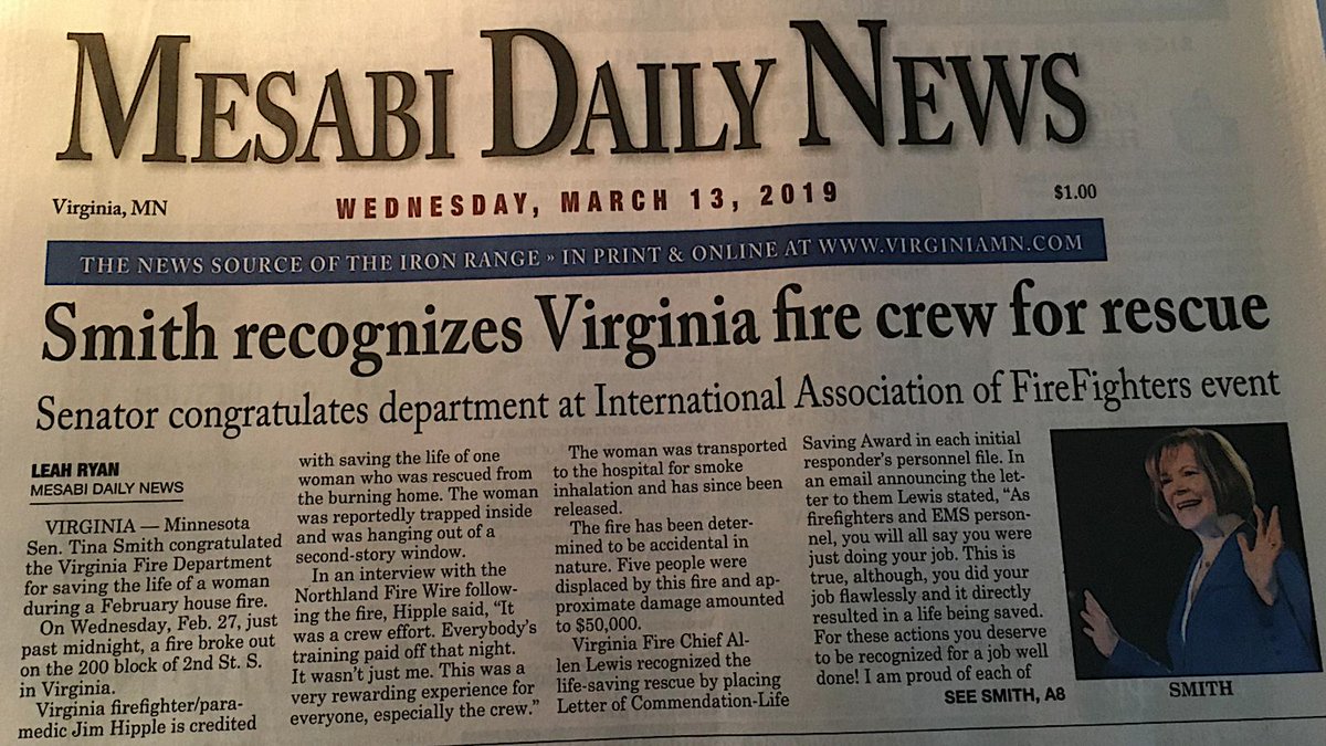 Glad I could recognize Minnesota’s Virginia Fire Dept for its work to save a woman’s life when I was speaking to firefighters gathered in D.C. Jim Hipple & his crew rescued her from a 2nd story window at about 12 AM. Check out today’s