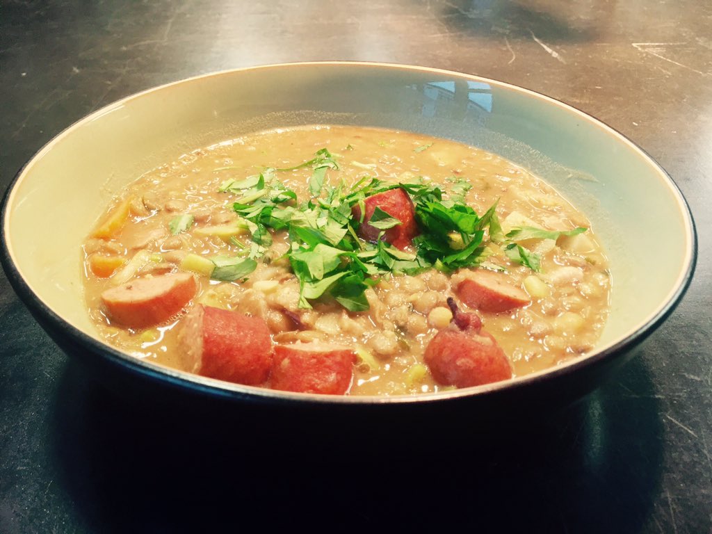 Das Wetter kann uns gestohlen bleiben! Drum: Linseneintopf mit Speck und Mettwürstchen.